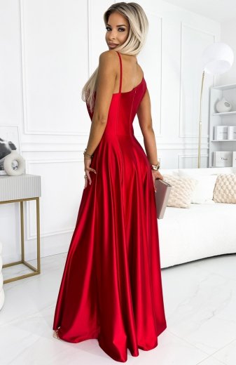 Numoco 512-5 JULIET elegancka długa satynowa suknia z dekoltem i rozcięciem na nogę